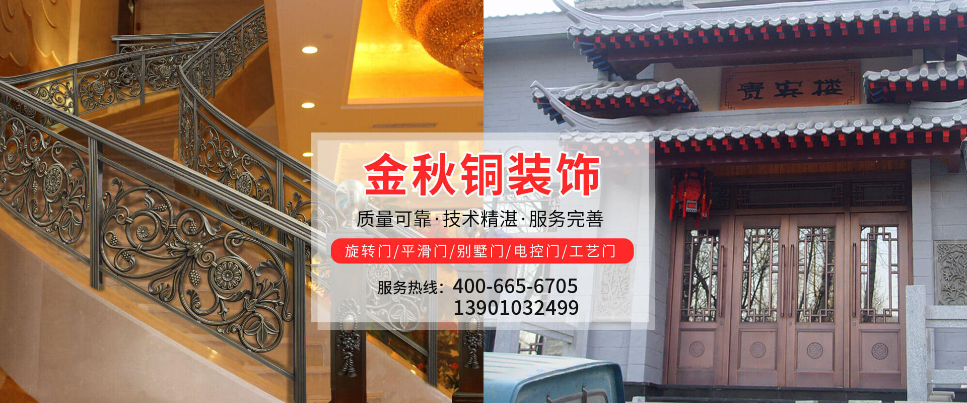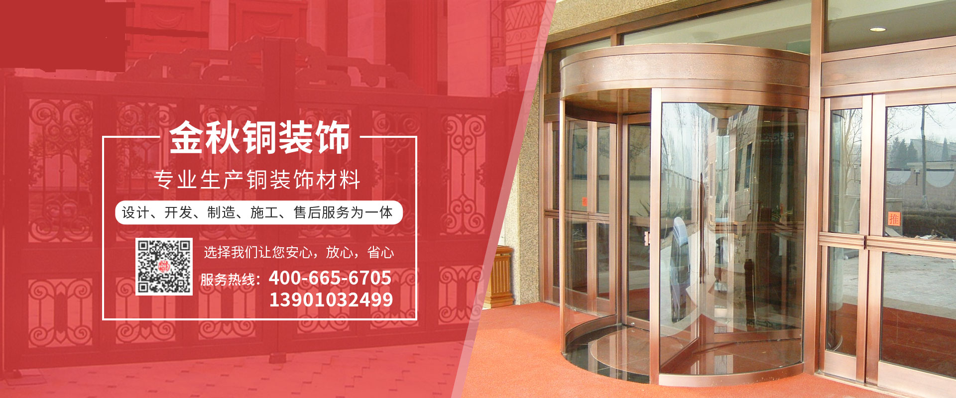 北京金秋銅裝飾材料有限公司是專業(yè)生產(chǎn)銅裝飾材料及設(shè)計(jì)、開發(fā)、制造、施工、售后服務(wù)為一體的大型綜合企業(yè)??沙薪咏ㄖ~裝飾工程及五星級酒店、別墅、博物館、樓樘管所等高檔銅裝飾項(xiàng)目;生產(chǎn)各種規(guī)格的旋轉(zhuǎn)門、平滑門、別墅門、電控門、工藝門、旋轉(zhuǎn)護(hù)欄、屋頂銅飾防水瓦、浮雕壁畫......